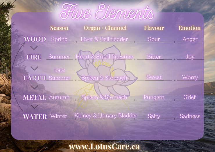 The elements are thus associated with Organs (and their respective channels), Seasons, Flavours, Colours, etc.